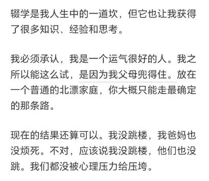 为啥会辍学?讲真哈,这些年我见过不少身边案例。孩子辍学的原因,最多的就是两种:要么是娃突然沉迷网络或手游,没办法回到正常学习节奏,结果一步跟不上步步跟不上最终发展成彻底不想上学。要么就是父母对娃有变态般的“高期待”,导致娃出现心理问题,不得不辍学。