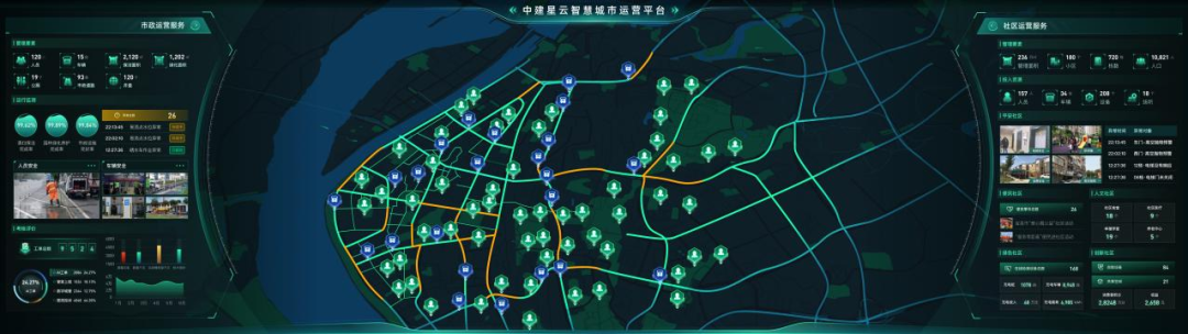 智慧赋能提效率:项目打造宜昌市首个城市大管家智慧运营平台——“中建星云”,融合物联网、人工智能、大数据等前沿技术,构建智慧物业、智慧社区、智慧环卫、智慧园林、智慧市政五大核心应用场景,实现人员智能调度、车辆智能监管及无人化自动作业,在提升管理服务效率的同时,有效降低运营人力成本。