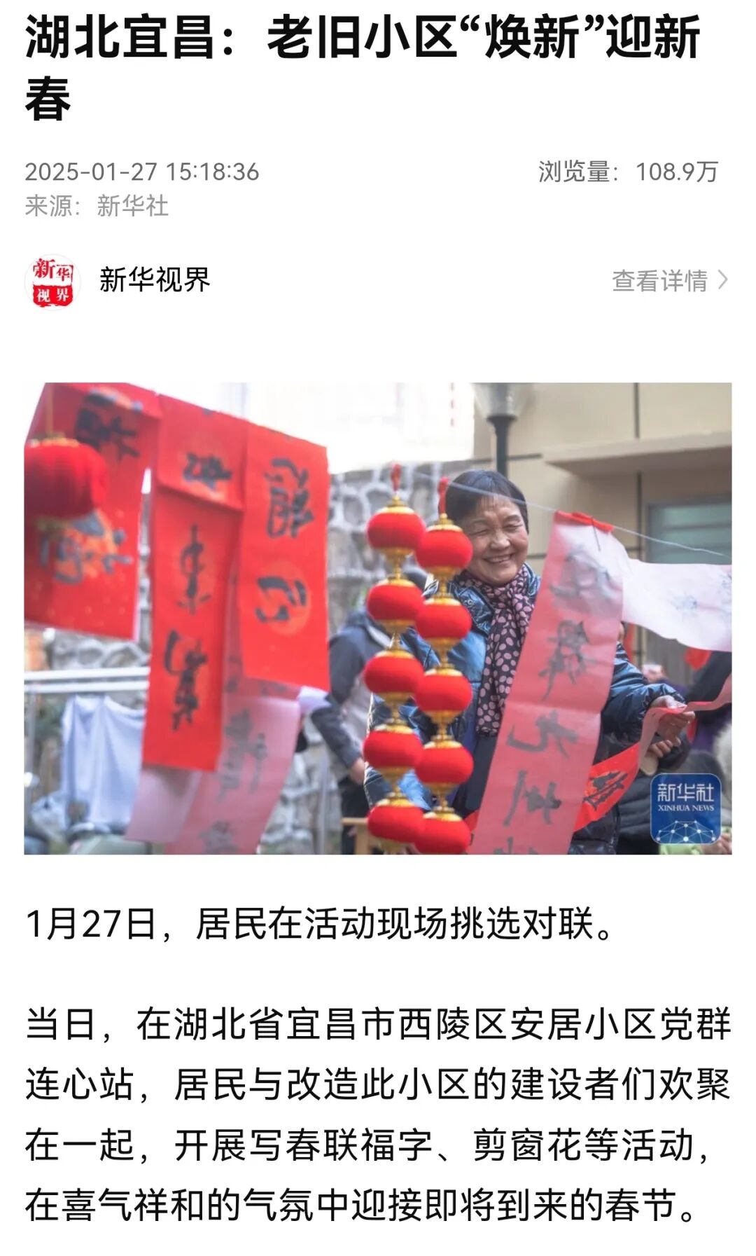 近年来,湖北省宜昌市联合中建三局等单位,推进城镇老旧小区改造,通过房屋修缮、雨污分流、加装电梯、管线规整等工程,改善居民生活环境,提升群众满意度和幸福感。